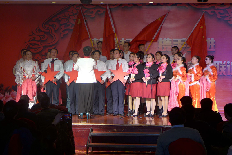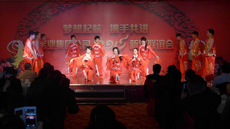 17點整,迎新春聯歡會正式開始,首先由房地產開發公司一支舞蹈《開門紅》拉開了晚會序幕,緊接著獨唱、詩歌朗誦、曲藝等節目精彩紛呈、高潮迭起,晚會在各分公司、各部門同事共同參與下將公司團結協作、多才多藝的精神和風貌展現的淋漓盡致。最后以公司譚副總經理一曲豪情萬丈的《祝酒歌》來開始我們團圓的酒會。公司大家庭歡聚一堂,其樂融融,為新的一年舉杯同慶,每個人臉上都洋溢著自豪與快樂。