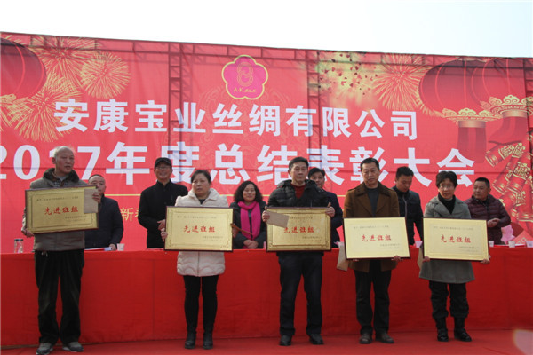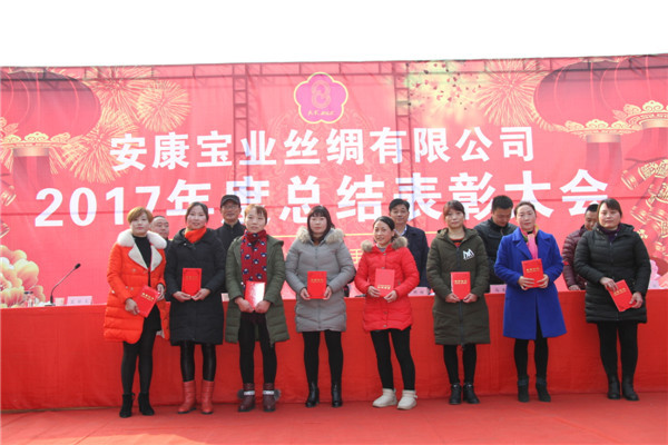 2018年2月8日,陜西安康寶業絲綢有限公司2017年年會在絲綢公司廠區內隆重舉行,寶業集團董事長張龍寶先生、總公司副總經理譚照明先生、副總經理代均康先生、寶業農貿市場總經理馬龍先生與絲綢公司全體員工歡聚一堂,共度聯歡。