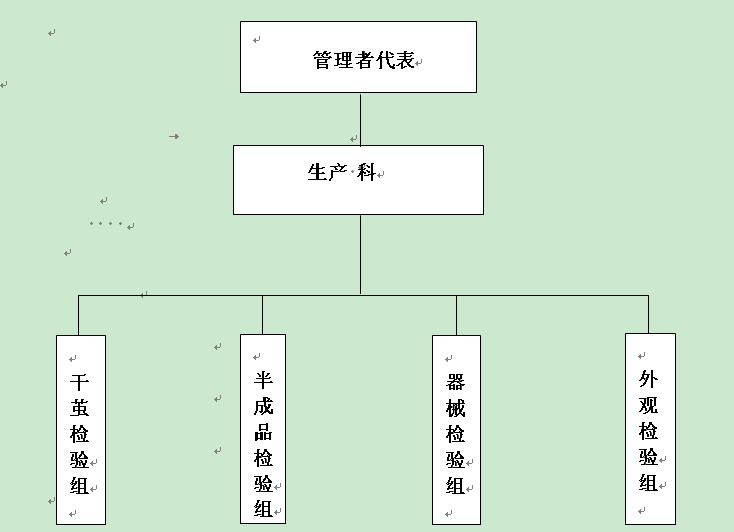 本公司確立以管理者代表負(fù)責(zé)的質(zhì)量管理組織,設(shè)立符合產(chǎn)品質(zhì)量要求的管理部門(mén),由生產(chǎn)科全面負(fù)責(zé)公司的產(chǎn)品質(zhì)量。下設(shè)四個(gè)組,即干繭檢驗(yàn)組、半成品檢查組、器械檢驗(yàn)組、外觀檢驗(yàn)組。